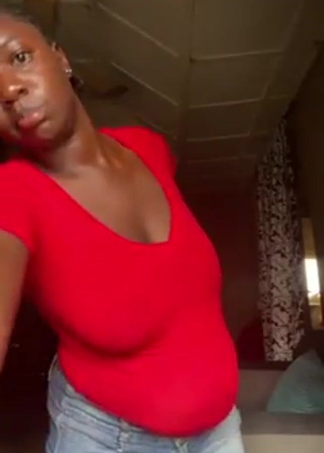 A woman stands indoors, taking a selfie. She is wearing a red, short-sleeved v-neck shirt and denim shorts. She has dark skin and appears to be looking at the camera. She touches her stomach with her left hand. A ceiling fan is visible in the background, as well as a window covered with a curtain. A sofa is also visible in the background.