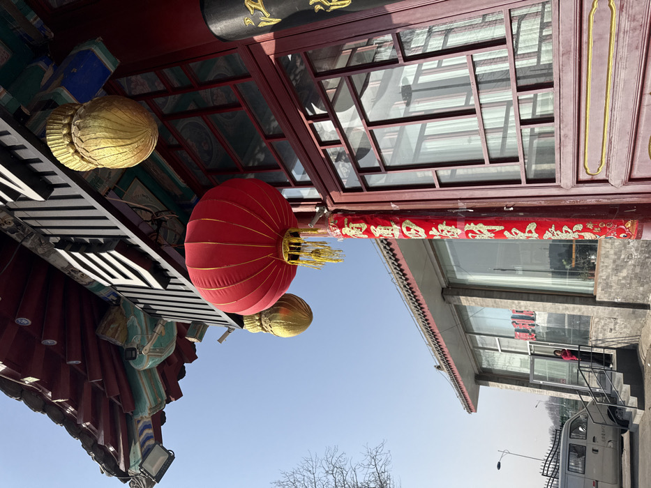 The image depicts an outdoor scene in Chaoyang District, China, under a clear blue sky. In the foreground, a prominent red spherical lantern with yellow tassels is suspended from an ornate, dark red wooden eaves structure. To its left, a smaller, golden, lotus-shaped lantern is also visible. The eaves feature decorative green and blue accents, and a white rectangular light fixture is attached. Below the red lantern, a red banner with gold Chinese characters is affixed to a dark red column. Adjacent to this column on the right is a dark red wooden door with a grid pattern of glass panes and decorative golden trim. To the left of the foreground structures, a multi-story building with large reflective glass windows and a gray brick facade is visible. This building features a traditional dark-tiled Chinese roofline. A red sign with white or gold characters is discernible through one of its large windows. A single female individual, dressed in dark clothing with a red element, stands near the ground-level entrance of this building, adjacent to a set of dark gray stairs with a metal handrail. In the far left background, a light-colored minivan is parked or moving on a paved surface, and a bare tree branch is visible against the clear sky. A street light pole can be seen in the distant background.