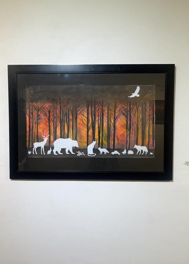 rtwork on display in a gallery. The first image is a framed print of a forest scene with a colorful sunset backdrop, featuring white silhouettes of animals like deer, bears, and birds. The video then pans to show an abstract painting in a white frame, featuring a mix of red, pink, and yellow colors, followed by a series of other framed artwork pieces hanging on the wall.