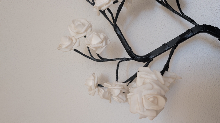 The image displays a close-up section of a decorative artificial tree or branch, positioned against a light-colored, textured wall in Venray, Netherlands. The tree structure features multiple dark, slender branches, which appear to be constructed from a hard material and partially wrapped with black tape or a similar dark, glossy material. Attached to these branches are approximately ten artificial white roses, exhibiting layered petals consistent with foam or fabric construction. No individuals or discernable actions are present. The background wall shows a subtle, stucco-like texture. Lighting is uniform, suggesting an indoor environment.