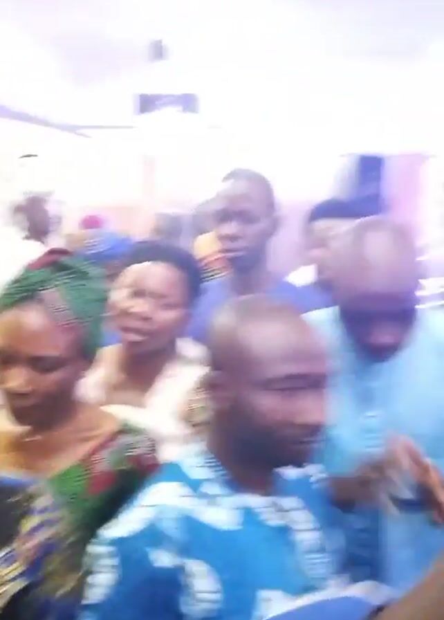 crowded indoor space with several people. They appear to be dressed in colorful, patterned clothing, suggesting a festive or ceremonial occasion. The camera is shaky, indicating it is being held by someone moving within the crowd. The background shows a white ceiling with what may be decorative lighting. Several of the people are looking in the same direction, possibly towards a focal point of the event.