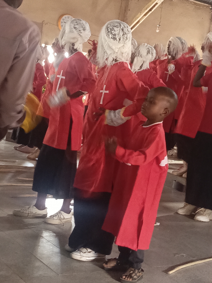 The image depicts an indoor scene within a building in Akwanga, Nigeria, featuring a group of individuals, primarily adults, and one young male child. The subjects are uniformly dressed in long-sleeved red tunics; several adults also wear black skirts or trousers and white lace head coverings. Multiple tunics display a white cross emblem on the back. A young boy, positioned in the foreground, wears a red tunic, black trousers, and brown sandals. He looks slightly upwards and to the right, with his hands slightly raised. An adult's arm is visible across the boy's upper back. Adult footwear includes white sneakers. The environment consists of a light-colored floor, possibly concrete, and light-colored walls, one of which features a circular clock. Bright ambient light originates from the background. A light-colored stick is visible on the floor in the bottom right.