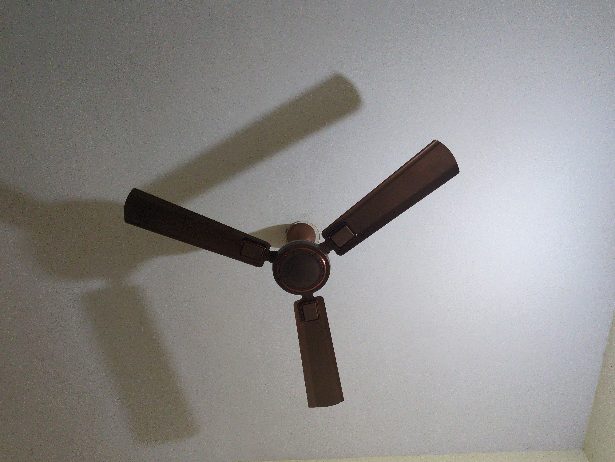 A stationary three-bladed ceiling fan, finished in dark brown or bronze, is mounted against a white ceiling. Each blade is rectangular with a rounded outer end, extending from a circular central housing. A single, strong light source, positioned off-camera, casts distinct, elongated shadows of the fan blades and central unit onto the ceiling, primarily towards the lower left quadrant of the frame. The ceiling surface appears uniform in texture. No individuals or other objects are present in the immediate vicinity or depicted engaged in any action or interaction. The scene is located in Bengaluru, India.
