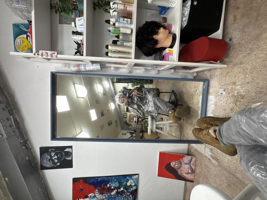 A salon space features a large mirror reflecting a person seated in a chair, wearing a clear cape and hair covering. Art adorns the wall beneath the mirror. Adjacent to the mirror, shelves display hair products, supplies, and a mannequin head. A person's legs covered in a plastic cape appear in the foreground, with brown boots on the floor.
