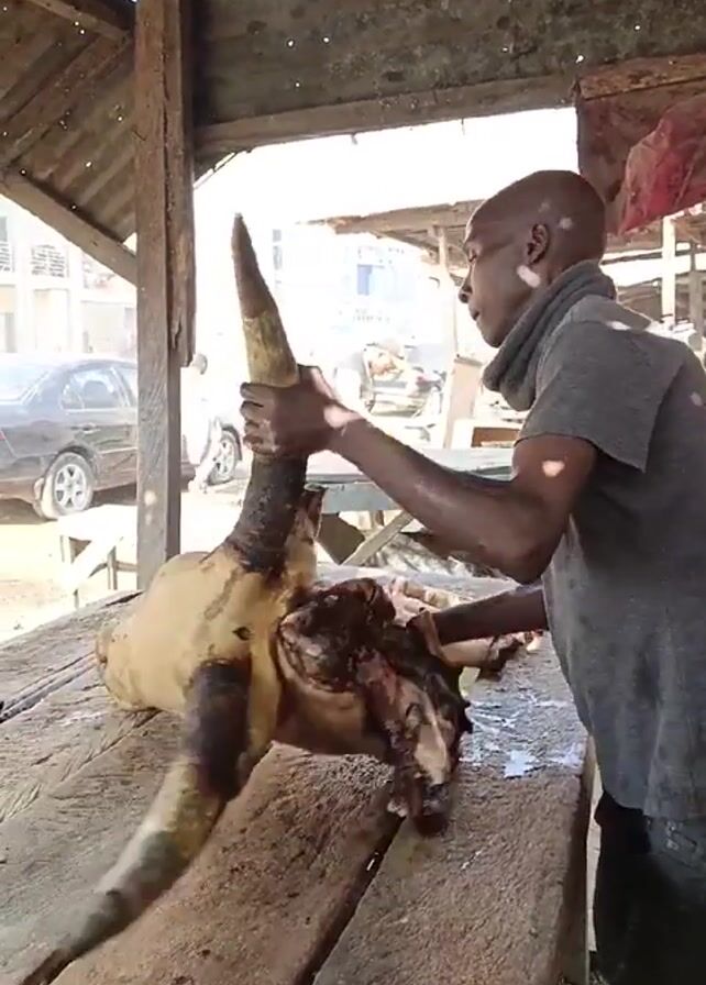 A man is preparing a cooked animal head for sale, likely a goat or cow, on a wooden table. The head has horns and is partially cut open, revealing the meat inside. The man uses his hands to move the head around and likely further prepare it. He is wearing a gray shirt and dark pants. The scene takes place in an open-air structure, possibly a market stall, with a corrugated metal roof and wooden supports. The background shows a street with cars and other buildings. The overall impression is a raw, food-preparation environment in a developing country.