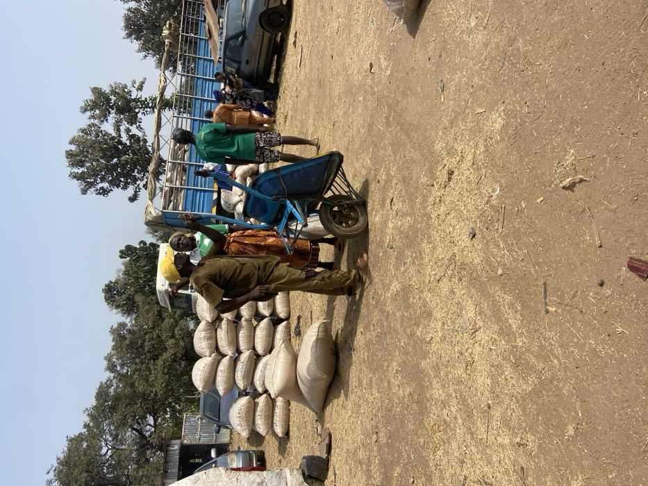 This image depicts an outdoor agricultural market or processing area in Tataura, Nigeria, under a clear, bright sky
