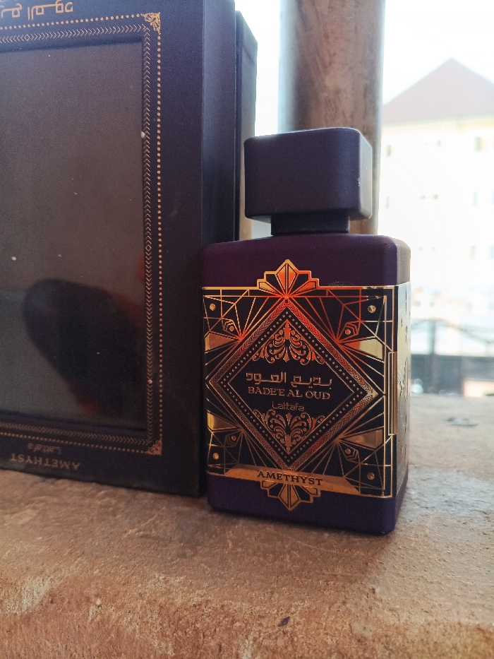 A purple perfume bottle, labeled "BADEE AL OUD Lattafa" and "AMETHYST" with elaborate gold detailing, stands upright on a textured, light-brown or reddish-brown concrete surface