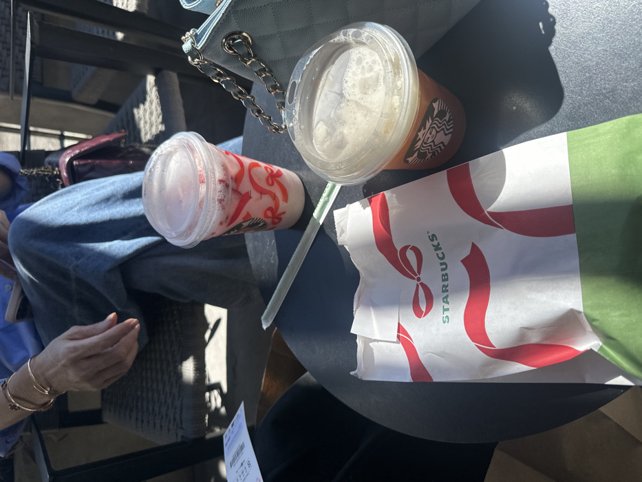 Two Starbucks cups with lids and a straw rest on a table next to a folded Starbucks paper bag. One cup is clear with red ribbon designs, while the other is partially visible with the Starbucks logo and a light-colored drink. A light blue quilted purse with a chain strap sits nearby. A person wearing a blue shirt and jeans is visible, with their hand adorned with gold bracelets. A small portion of a receipt can be seen on the table.