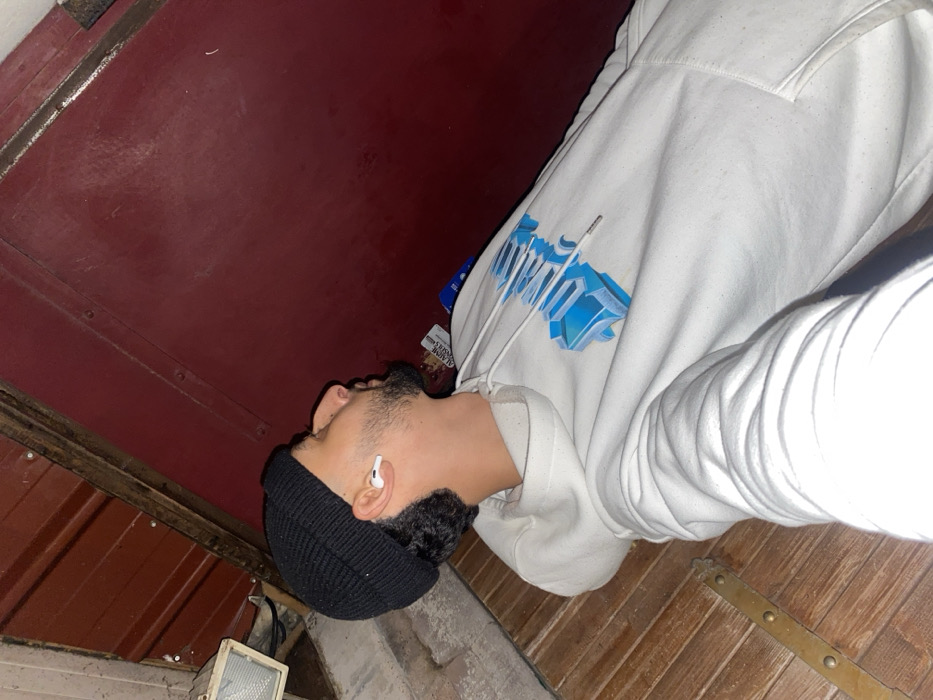 A person wears a black beanie and a white hoodie with a blue design. They have an AirPod in their ear. The background includes a maroon or dark red wall, possibly a door, and a wooden or paneled surface. A small white object is on the ground near a concrete or weathered surface. The image is taken from a low angle and is rotated counter-clockwise.
