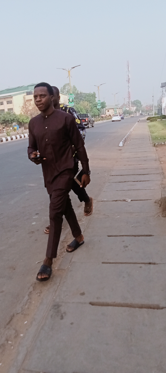 The image depicts a daytime street scene in Kabala, Nigeria. Two adult males are walking on a concrete sidewalk. The foreground subject, a dark-complexioned male, wears a brown long-sleeved button-up shirt and matching trousers with black slide sandals. He holds a black smartphone in his left hand and a light-colored rectangular object in his right hand. A second, partially obscured dark-complexioned male walks behind him, wearing a dark patterned shirt and brown slide sandals. To the right of the sidewalk is an asphalt roadway, separated by a low median with white and black striped barriers. Several vehicles are visible on the road, including a dark Toyota pickup truck and a white sedan in the distance. Streetlights with decorative, multi-arm tops are spaced along the road, some displaying "OPay" and "Face ID" promotional banners. In the background, multi-story buildings and green vegetation are visible. A tall red and white cellular tower stands prominently in the far distance to the right. The sky is a uniform, light gray, indicating an overcast or hazy condition.