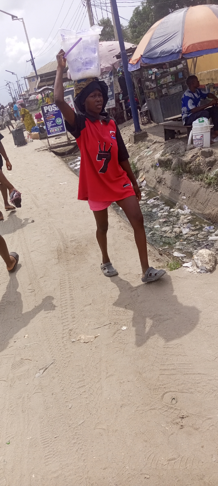 The image depicts an outdoor street scene in Ohoro, Nigeria, characterized by an unpaved sandy path with visible tire tracks and footprints. In the foreground, a young individual, likely female, walks towards the left of the frame. She wears a red polo shirt with black sleeves and collar, pink shorts, a black head covering, and grey sandals. On her head, she balances a clear plastic bucket containing white material and a purple handle, which she supports with her raised right hand. Her shadow is cast to her right on the ground. To the immediate right of the path, an open concrete drainage ditch runs parallel, filled with murky water and various discarded plastic items and refuse. In the mid-ground to the left, the lower legs of two other individuals are partially visible, one wearing a brown slipper and the other barefoot. A black rolling suitcase is also present on the path. Further left, a white sign with blue text advertising "POS" services is visible, along with obscured figures and buildings with corrugated iron roofs. In the mid-ground to the right, a male individual in a blue patterned shirt sits on a wooden bench beneath an orange and blue striped umbrella. A white bucket labeled "PRIMES Paints" rests beside him. Behind this figure, a market stall with various items displayed is visible. Utility poles line the street. The sky is bright and overcast.