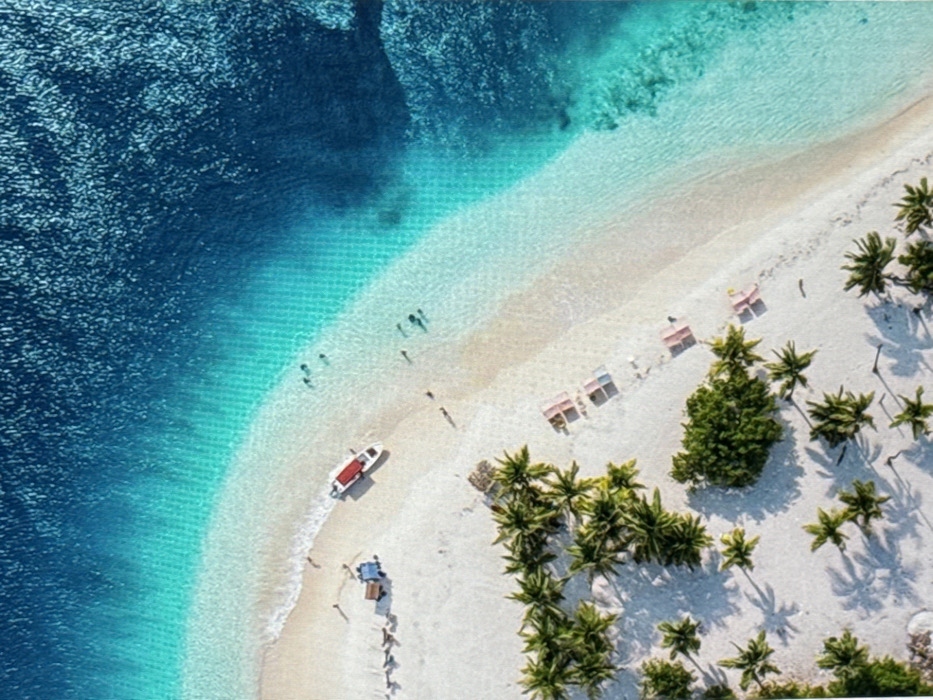 This aerial image depicts a tropical beach environment, entirely lacking any visual elements or geographical characteristics identifiable with the inland city of Gabrovo, Bulgaria. The scene features a crescent-shaped white sand beach meeting clear, gradient blue ocean water. The water transitions from light turquoise and transparent in the shallows, revealing the sandy bottom, to a deeper indigo further offshore. A white boat with red trim is positioned in the shallow, clear water near the shoreline. Adjacent to the boat on the sand, a small blue and brown object, possibly a vehicle or beach equipment, is visible. Several indistinct human figures are observed wading in the transparent shallow water, while other small figures are present on the sandy beach. On the wider expanse of the white sand, numerous green palm trees are scattered, casting shadows. A dense cluster of dark green foliage grows among the palm trees. Several light pink beach loungers, some with small white covers or umbrellas, are arranged in rows on the sand further along the beach.