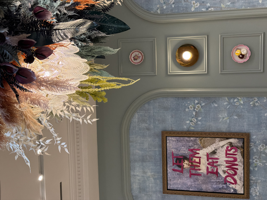 The scene shows a portion of a room's wall with decorative floral wallpaper and moldings. Three framed decorative plates and a light fixture are displayed above a framed painting with the words "LET THEM EAT DONUTS" scrawled in pink across a woman's portrait. A large floral arrangement hangs from the ceiling, dominating the left side of the frame.