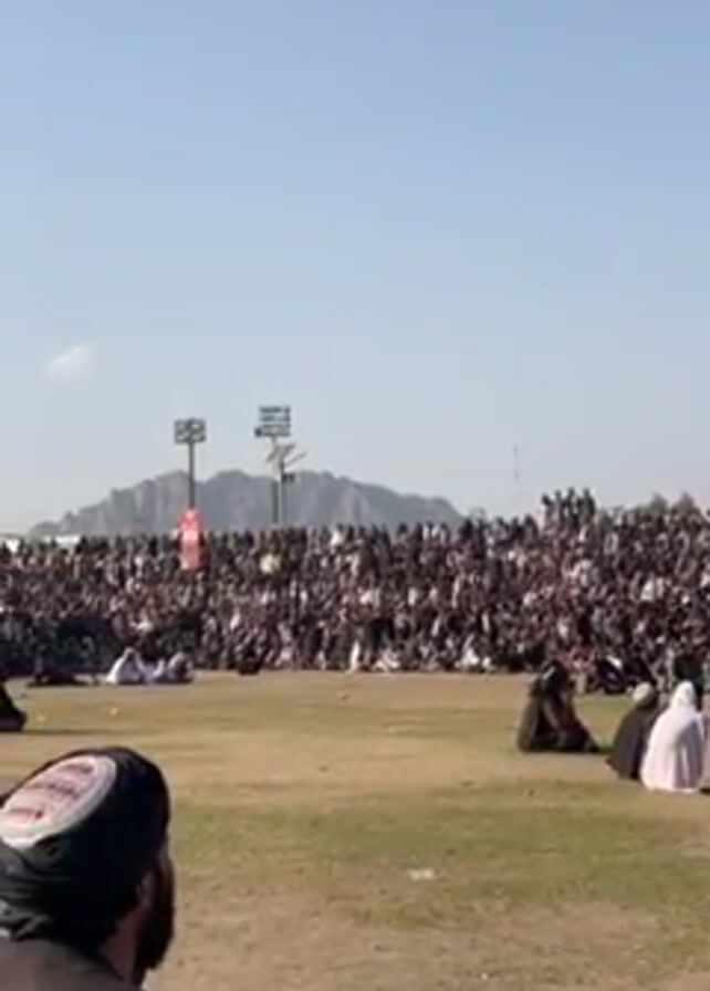 large crowd of people gathered in an open field, possibly a stadium or park, during daylight. The majority of people are sitting on the ground or in stands. They are dressed in dark clothing. Some figures are on the rooftops of nearby buildings. In the distance, there are mountains and communications towers. The sky is clear. Horn sounds can be heard.