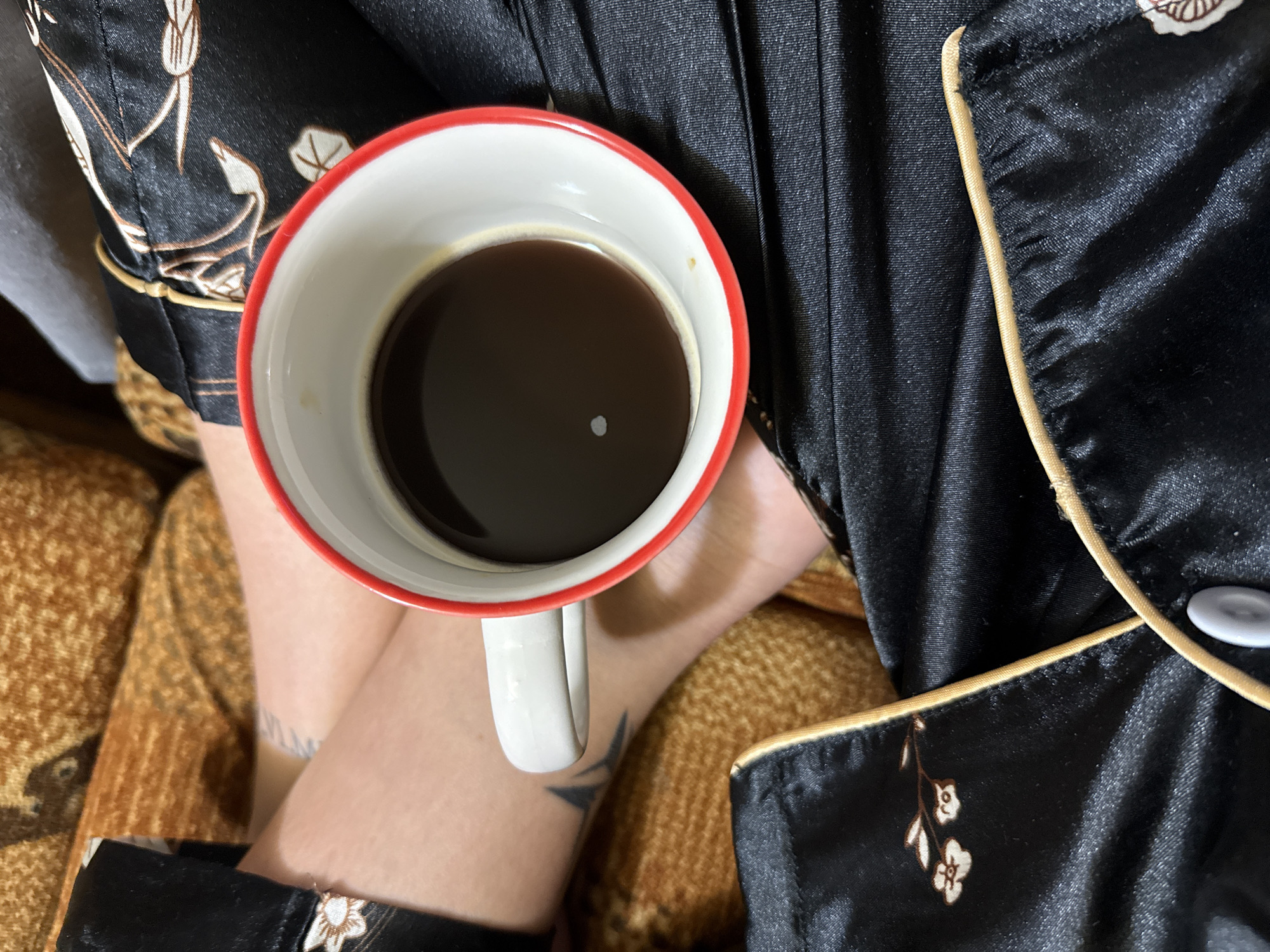 person holding a mug of black coffee. The mug is white with a red rim. The person is wearing black satin pajamas with a floral pattern and gold trim. The person's arms are crossed, and there is a tattoo visible on their wrist. The background is a brown textured surface. There is no evidence to suggest the image was taken in the city of Pleven, Bulgaria.