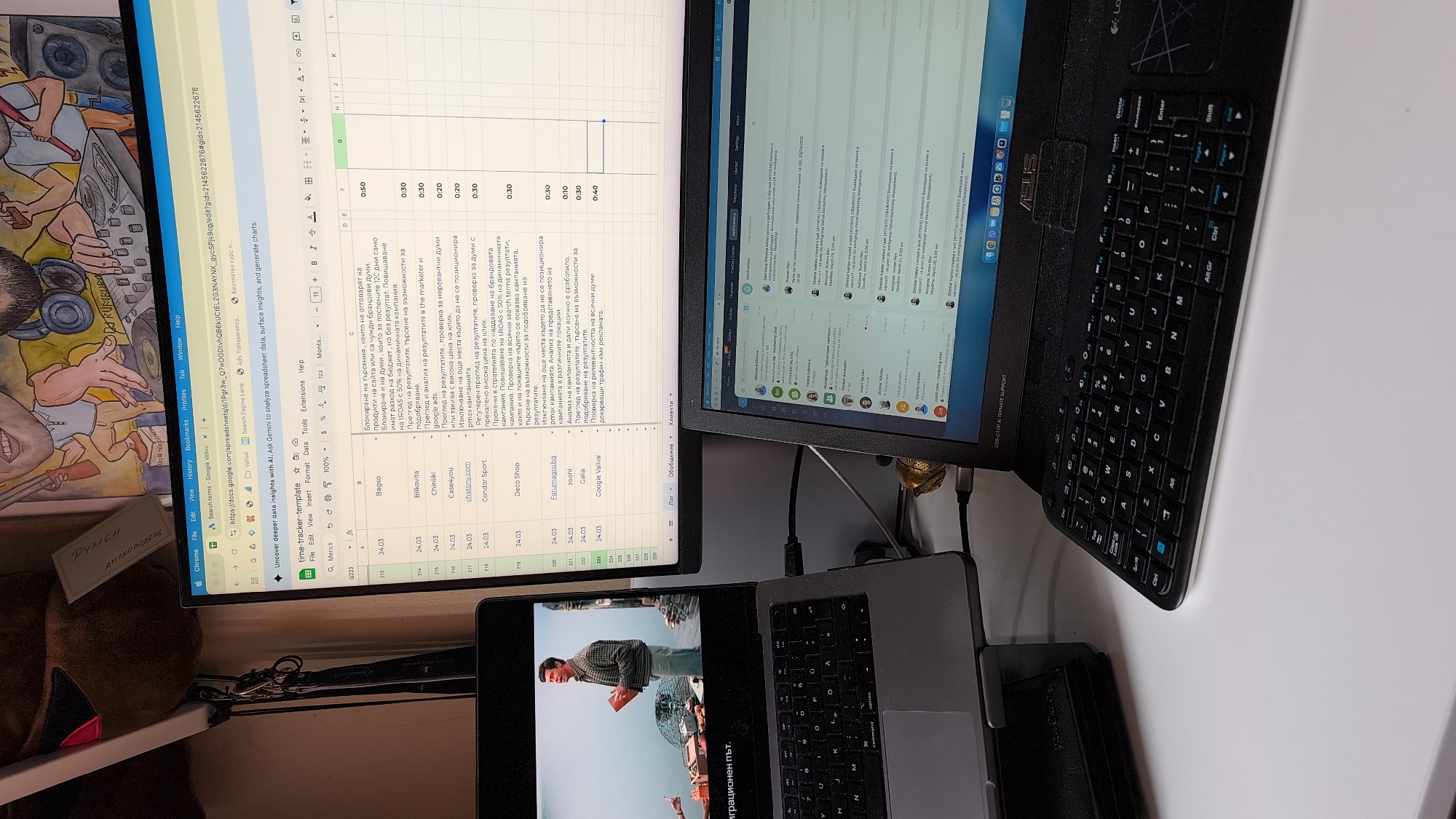 The image displays an indoor desk environment, specifically a workspace, located in Oreshak, Bulgaria. A white desk surface occupies the lower portion of the frame. On the left, a silver MacBook laptop is elevated on a black stand, displaying a video of a male character, likely from the television show *Friends*. To the right of the MacBook, a larger external monitor exhibits a Google Sheets spreadsheet titled "time-tracker-template," detailing rows of data in Bulgarian, including website names and numerical values, with "Search terms - Google Valiva" visible in the browser tab. Adjacent to the external monitor on the right, a black ASUS laptop is positioned with an external black Logitech keyboard in front of it. The ASUS laptop's screen shows an email client or communication application. A white LED desk lamp extends from the upper left, illuminating the area. In the background, above the external monitor, a colorful illustration of a cartoon DJ figure is visible, alongside a dark brown textured object and a small dark container marked "DHC." Multiple cables connect the electronic devices. The scene indicates an active, multi-screen work setup.