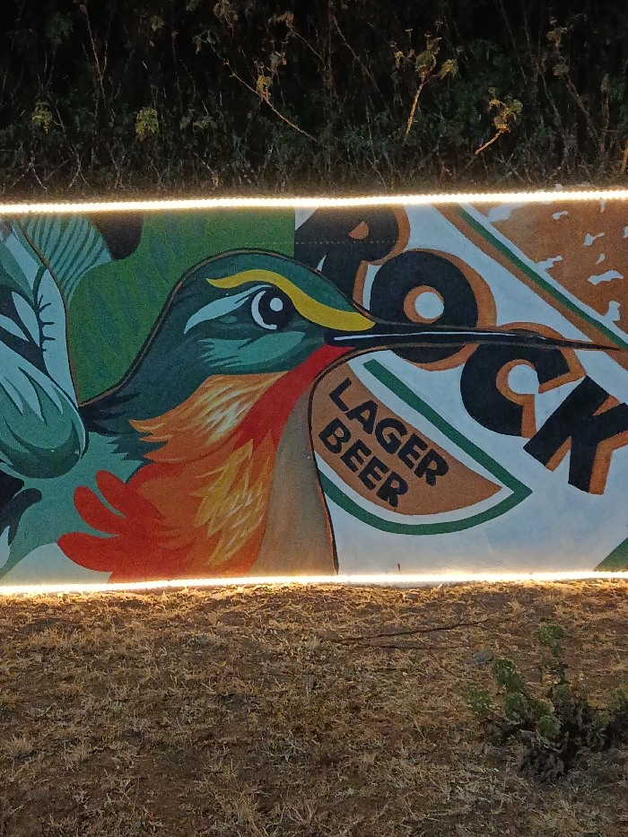 A mural illuminated by two rows of lights features an illustration of a hummingbird. The bird has green and grey plumage with a bright orange throat and a yellow streak above its eye. The bird's beak is pointed towards the right. A design behind the bird promotes "ROCK LAGER BEER" in bold lettering. The background is grassy with some vegetation.
