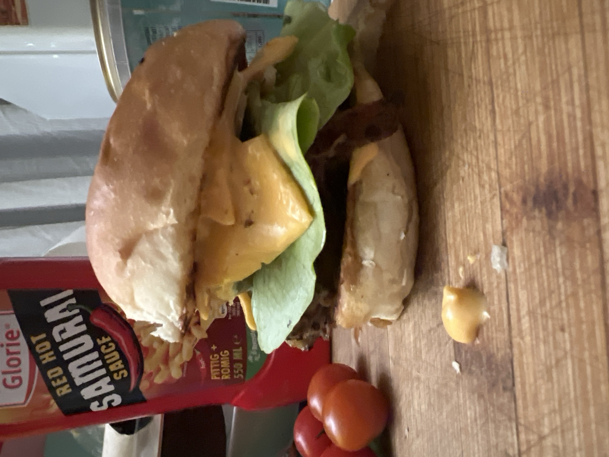 The image displays a close-up view of a prepared burger, sauce bottle, and tomatoes resting on a wooden surface, likely a kitchen counter or cutting board, in Geldrop, Netherlands. The primary subject is a tall, assembled burger, centrally positioned and slightly angled to the right. It features a light brown bun, a dark brown meat patty, vibrant green lettuce leaves, and two slices of melted orange cheese. A small, yellow-orange dollop of sauce or melted cheese is visible on the wooden surface directly in front of the burger, along with a few crumbs. To the left of the burger, three whole, ripe red tomatoes are clustered on the wooden surface. Behind them, a red plastic squeeze bottle, identified as "Glorie Red Hot Samurai Sauce," stands upright. The bottle's label, in black and white, displays a red chili pepper graphic and the Dutch text "PITTIG + ROMIG" (Spicy + Creamy) and "550 ML," confirming the Dutch context. In the blurred background on the right, a portion of a light blue-green cylindrical container with a metallic rim is visible. The wooden surface beneath the objects shows distinct grain patterns and minor wear marks. No individuals are present in the scene. The lighting appears to be interior, illuminating the food items.