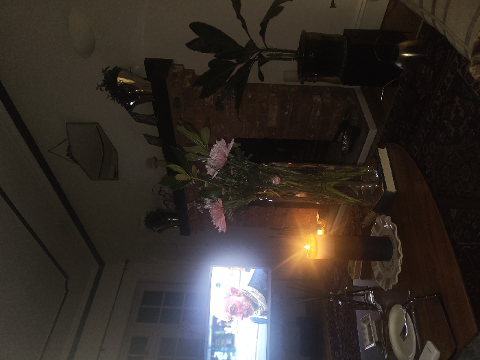 An interior scene captured in low light depicts a living space within Uttlesford, United Kingdom. A dark wooden coffee table in the foreground holds a lit pillar candle, dark at its base and lighter towards its glowing wick, resting on a white ruffled plate. Adjacent is a clear glass vase containing a bouquet of pink chrysanthemums and green foliage, positioned atop a book. To the left, a white ceramic plate with a silver fork and a dark glass diffuser bottle are visible. A television screen, emitting the brightest light, is visible in the background, displaying a close-up of an older male with a beard and a scarf. To the left of the TV, a window with white panes is discernible. To the right of the coffee table, a brick fireplace with a dark wooden mantelpiece is adorned with plants in metallic pots and other decorative items. An irregularly shaped mirror hangs on the white wall above the mantelpiece. Further to the right, a large potted plant sits on a dark stand, with a metallic watering can on the floor nearby. The room features white walls, dark ceiling beams, and a dark patterned area rug. No individuals are present.