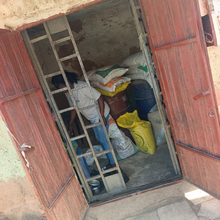 An indoor scene in Jos, Nigeria, is captured through an open, weathered red metal double door, revealing the entrance to a commercial or storage unit. A metal security grille, composed of square grid patterns, spans the doorway. Behind this grille, an individual, appearing to be female with dark hair, dressed in a light-colored t-shirt with partial dark lettering and blue jeans, is seen bending forward, extending her right arm downwards. The interior of the room is densely packed with inventory. Numerous large sacks, predominantly white, yellow, and multi-colored, are piled against the rear wall and on the concrete floor. Visible labels on some sacks include "ULTIMA FEEDS" and "FARM FEEDS," indicating agricultural products or animal feed. Two large industrial barrels, one dark brown/red and one blue, are positioned behind the stacked sacks. The interior walls are rough, unpainted concrete. A silver metal pot rests on the concrete floor near the entrance. The exterior wall visible adjacent to the left door is light green/beige and exhibits signs of wear. A white cord is tied to the handle of the left door.
