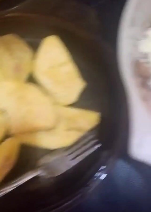 A person is preparing a meal. The video starts with a plate of fried yam, followed by a bowl containing a pink liquid mixed with a white powdery substance. The person gives a peace sign over the bowl.