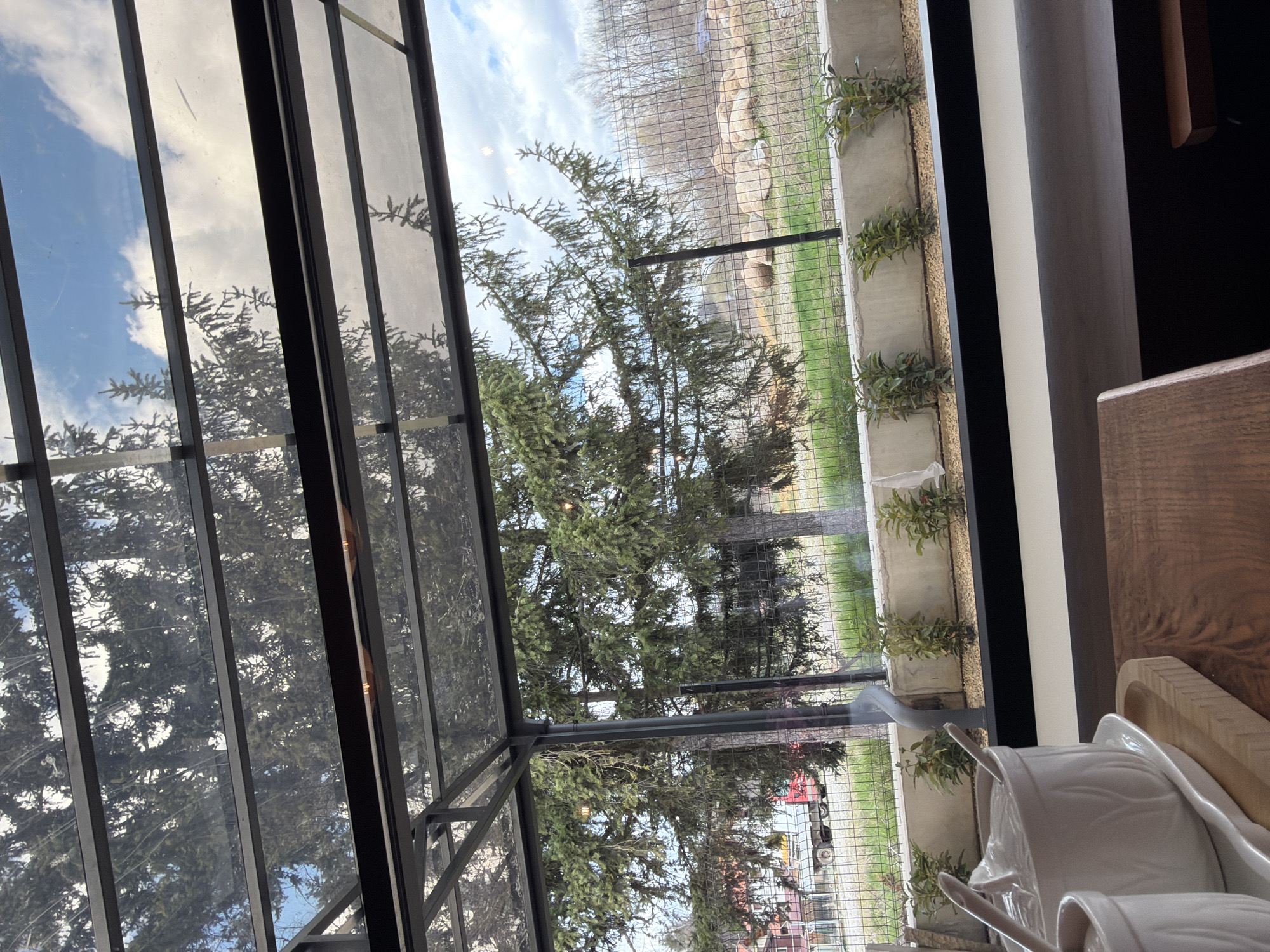 The image depicts an outdoor scene viewed through a window structure with a black metal frame. Outside the window, there is a large evergreen tree in the foreground, with a wire fence separating it from a grassy area and a low concrete wall. The scene extends to a distance with trees, and structures visible in the background. Inside, to the right of the window, there is a table with white dishes. The location is likely Rudartsi, Bulgaria.
