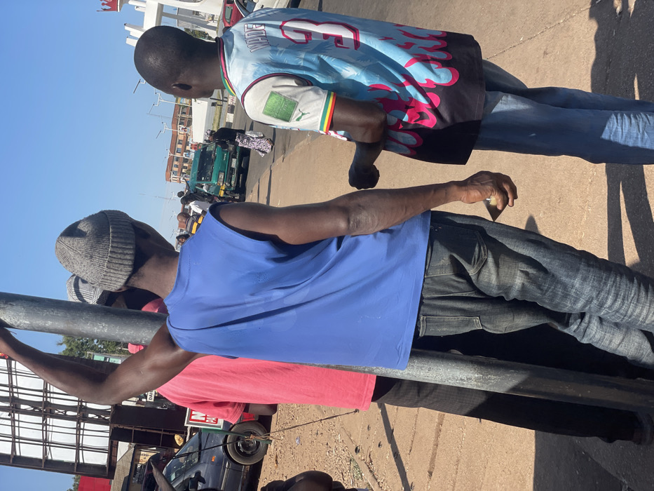 The image depicts an outdoor street scene in the city of Barakin Lerawi, Nigeria, under clear daylight conditions. Three individuals are prominently featured in the foreground, observed primarily from behind. The central figure wears a grey knit beanie, a blue sleeveless shirt, and blue jeans, leaning against a grey metal pole with their right arm raised, while holding a small, light-colored object in their right hand. To the right, another male figure wears a light blue and white jersey with "WADE 3" and pink/black flame graphics, along with blue jeans; his right arm is bent. Partially obscured on the left is a third individual in a pink t-shirt and dark pants, standing near the pole. The foreground subjects stand on a paved sidewalk with visible seam lines. In the mid-ground, a green van or small bus is present on an asphalt road, with other vehicles and pedestrians visible further down the street. To the far left, part of a dark-colored vehicle and a large metal billboard frame structure are seen. In the background, under a clear blue sky, buildings are visible, including one with a reddish architectural feature, and a distinctive white architectural gateway structure is located on the right side of the road. Shadows on the ground indicate a bright, high sun.