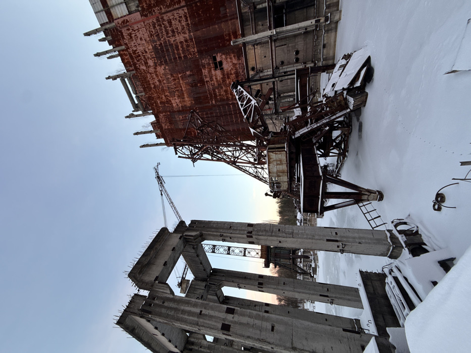Dilapidated, snow-covered industrial site with skeletal concrete structures reaching into the sky. Rust-colored metal buildings and various cranes are seen, some appearing abandoned and decaying. The image conveys a sense of abandonment and industrial decay against a backdrop of a winter landscape.