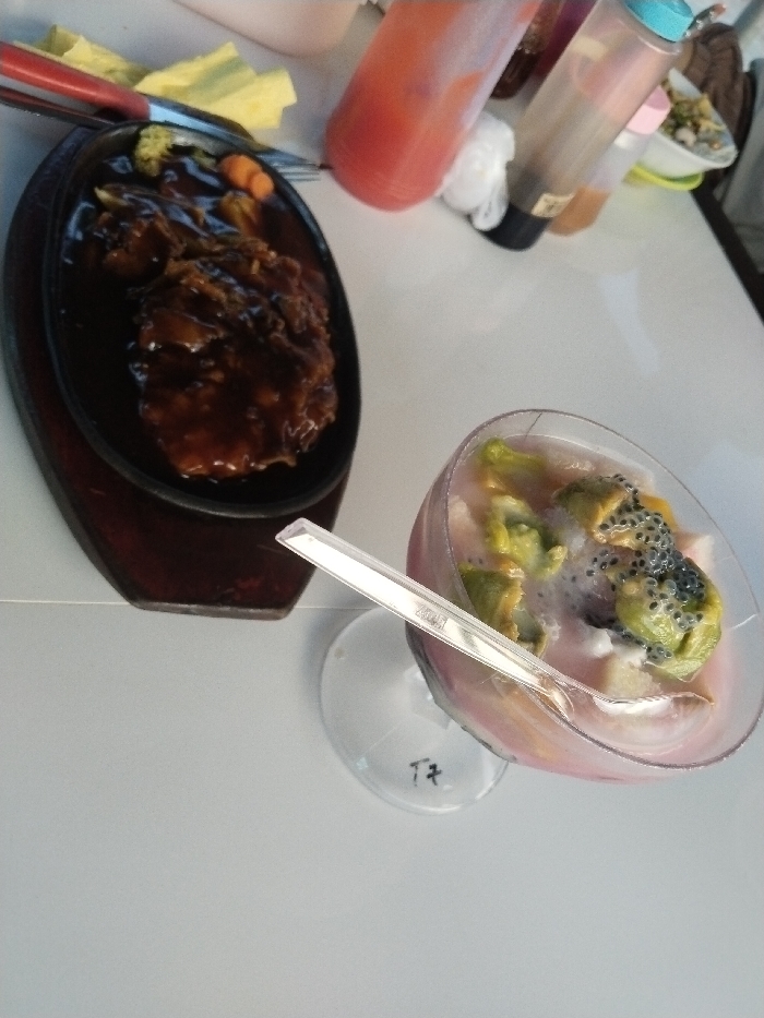 The scene, located in Tambontunong, Indonesia, depicts a meal and a beverage on a white table. On the left, a black oval sizzling plate, resting on a dark wooden base, contains a meat dish covered in dark brown sauce, accompanied by broccoli and carrots. A fork and knife with red handles are positioned beside the plate. To the right, a stemmed glass holds a pink-tinted beverage with green fruit chunks, white solids, and black seeds. A clear plastic spoon rests inside the glass, which bears the handwritten mark "T7" on its base. In the background, multiple condiment bottles, including a prominent red squeeze bottle and a clear bottle with a light blue cap, are visible. No individuals are present in the frame.