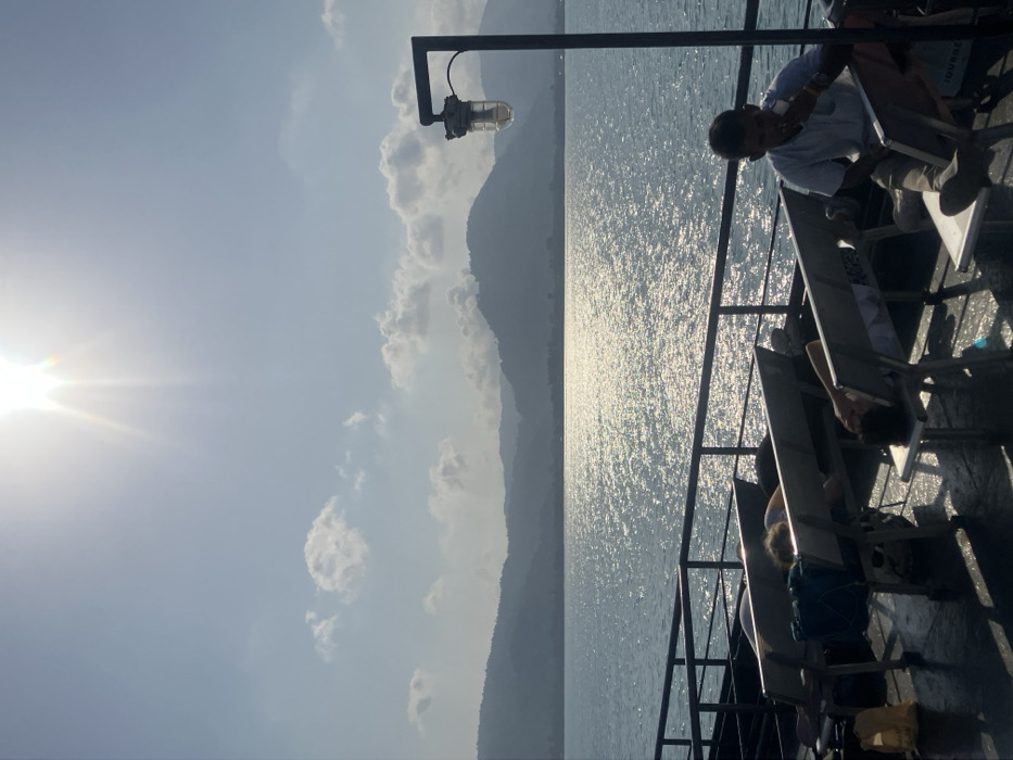 The image depicts a daytime scene on the deck of a ferry in the vicinity of Nathon, Thailand