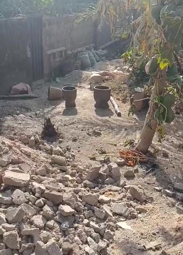 dirt ground area with scattered brick pieces, two large wooden mortar containers, and a large wooden pestle lying beside them. In the background, there is a block wall with bags and other items stacked against it. The area appears to be outdoors, with some foliage and a tree visible.
