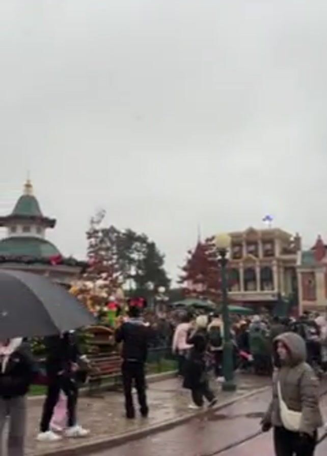 crowded outdoor scene on a cloudy day, likely at Disneyland