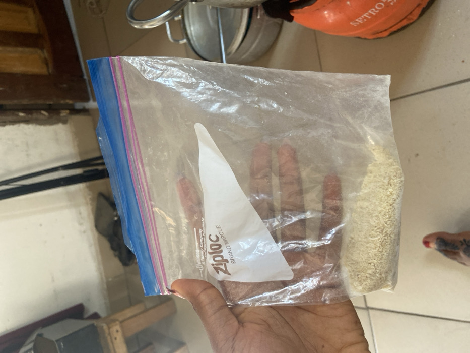 A dark-skinned left hand holds a clear Ziploc brand freezer bag containing approximately 100-150 grams of a light beige granular substance