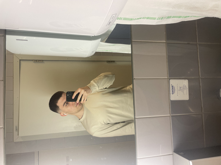 This image captures a male individual taking a mirror selfie in a public restroom in The Hague, Netherlands. **Scene Overview:** The scene is centered on a young adult male reflected in a mirror, holding a smartphone to capture his image. The reflection reveals a utilitarian restroom environment. **Individual:** The subject is a male, appearing to be a young adult, with short, dark brown hair styled with a faded cut on the sides. He has light stubble on his face and is wearing a plain, light beige long-sleeved crew-neck shirt. A white wireless earbud is visible in his left ear. He holds a black smartphone with a visible camera lens in his right hand, angled towards himself to take the photograph. His gaze is directed towards the smartphone's camera. **Objects and Environment:** The mirror reflects the subject and the interior of a restroom. To the right of the subject's reflection, two white, wall-mounted paper towel dispensers are visible. The dispenser closer to the viewer features "City-M," "Papiershop B.V.," "Biocart," and "100% BIO" branding, with a roll of white paper towels hanging from it, displaying a green striped pattern and "100% BIO" text along its edge. Below the mirror, a tiled wall is visible, composed of two horizontal rows of square tiles; the top row is light grey, and the bottom row is a darker grey. Centered on the darker grey tiles is a white sticker or sign that reads "GROHE electronic" and depicts graphic handwashing instructions. The edge of a light-colored sink basin is partially visible at the bottom of the frame. In the background of the reflection, behind the subject, is a plain, light beige door with a visible hinge on its left side and a small dark marking near its top left corner. The wall above the door and to its left is also light beige, with a tiled section near the ceiling line. The lighting appears to be artificial, providing a flat illumination. The mirror exhibits minor smudges.