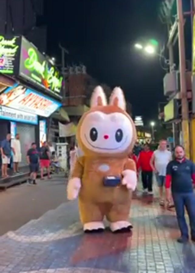 person wearing a large, inflatable cartoon bunny costume standing on a tiled street at night