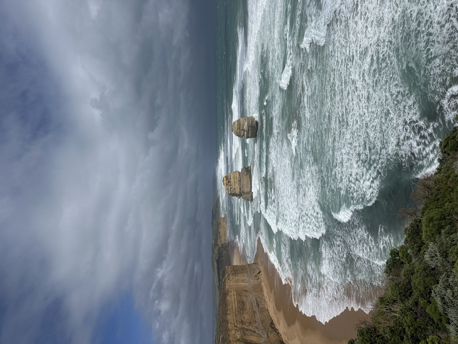 Twelve Apostles rock formations in the ocean. The sky is filled with dark storm clouds contrasting with patches of blue. The ocean is rough, with large waves crashing against the shoreline and rock formations. A beach stretches along the coastline, and green vegetation grows on the edge of the cliffs. The scene conveys a sense of dramatic natural beauty, emphasizing the power of the ocean and the ruggedness of the coastal landscape.