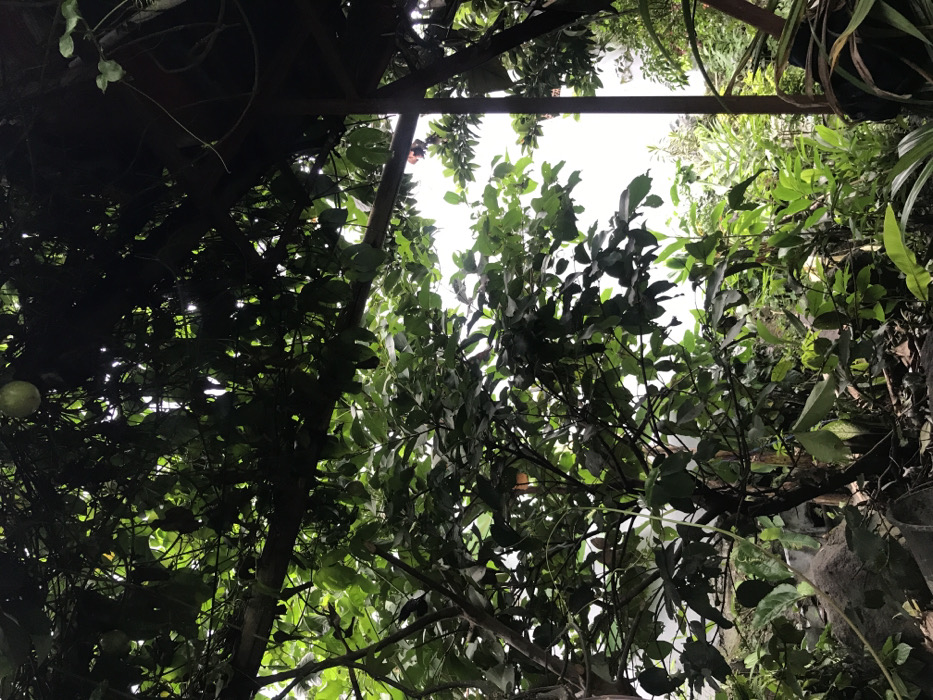 The scene depicts a dense, verdant outdoor environment located in Bogor, Indonesia. The perspective is upward, looking through a layered canopy of tropical foliage. An overhead structure, appearing to be a pergola or trellis constructed from dark-colored wooden or bamboo beams, is partially visible across the top and right side of the frame. This structure is heavily overgrown with climbing vines and broad green leaves, casting significant shadows. A single, ovoid fruit, light green to yellowish in color and consistent with a passion fruit, hangs from the overhead vines near the top center. Below the canopy, numerous trees and plants with various shades of green leaves fill the middle and lower sections of the image. Gaps in the foliage, particularly towards the right, reveal a bright, likely overcast sky. No human subjects or animals are visible. The ground level, partially obscured by plants at the bottom, consists of dark, unidentifiable elements amidst further vegetation.