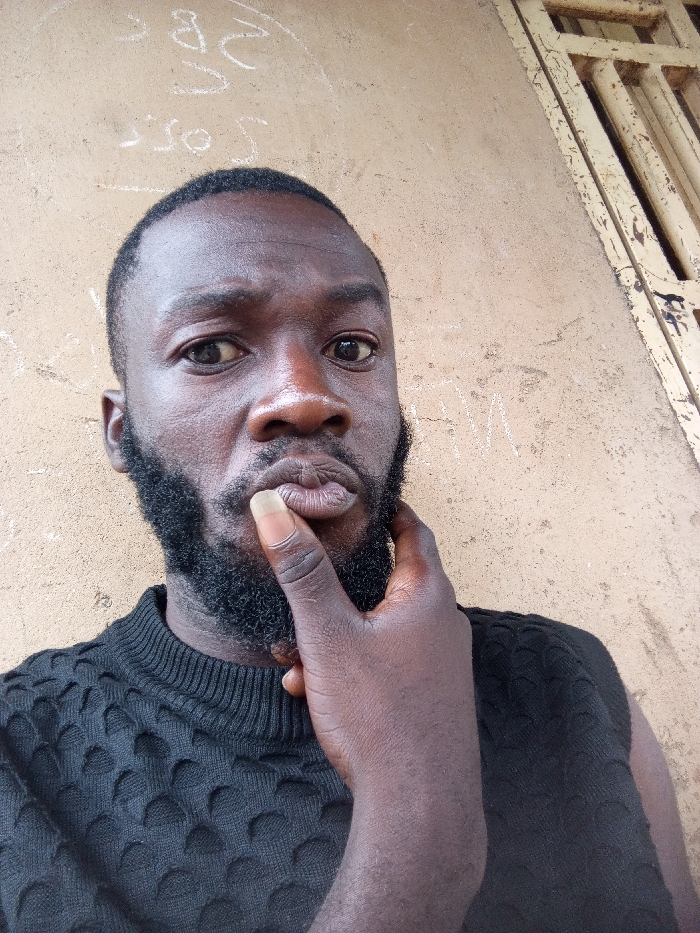 A dark-skinned adult male is depicted in a close-up, slightly upward-angled portrait against an exterior wall