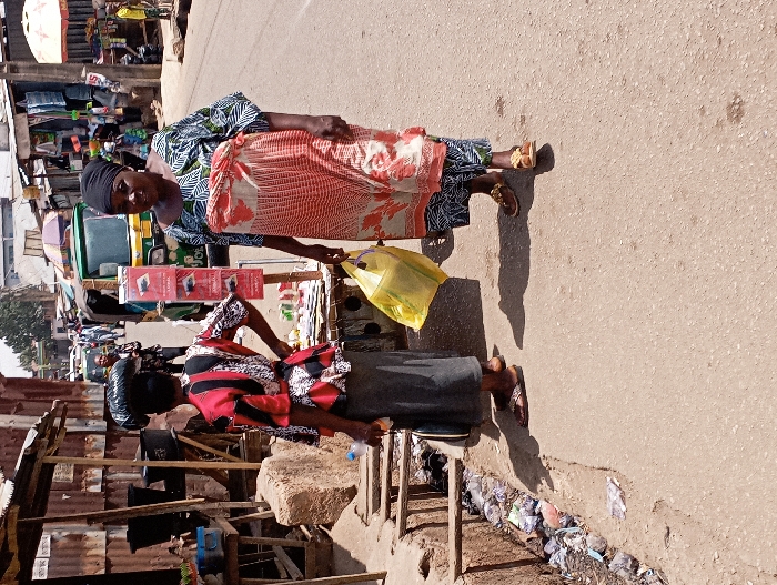 The image displays a daytime street scene in Jos, Nigeria, characterized by commercial activity. Two women are prominent in the foreground on a light-colored paved road. The woman on the left is oriented with her back towards the viewer, facing slightly right. She wears a red, black, and white patterned short-sleeved top, a dark grey skirt, and brown sandals, with a dark object balanced on her head. Her left hand is placed on her hip, and her right hand holds a small, clear plastic bottle. Adjacent to her, on the right, another woman faces slightly towards the viewer. She wears a dark headwrap, a green, black, and white patterned long-sleeved top, and an orange and white patterned wrapper tied over it. She carries a bright yellow plastic bag in her left hand and wears light brown sandals with decorative elements. To the immediate left of the first woman, an open, shallow drainage ditch filled with various plastic litter parallels the road. Beyond this ditch, a makeshift market stall, constructed from wood and corrugated metal, displays dark plastic buckets. A large concrete block is situated on the ground near this stall. In the midground, a red stand displaying vertically arranged packaged items, possibly recharge cards, stands near the second woman. Behind it, a green and yellow motorized tricycle (keke napep) is parked on the street. The background extends into a busy urban streetscape, lined with numerous additional market stalls, rudimentary shops with corrugated iron roofs, and blurred figures of pedestrians. The scene is illuminated by strong daylight, casting defined shadows.