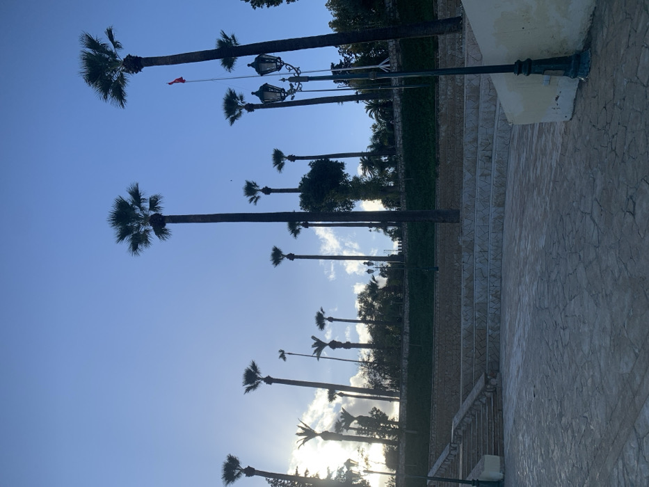 A row of palm trees stands against a blue sky with scattered clouds. Lampposts punctuate the line of trees. The ground is paved and leads to steps with a low railing. The scene appears to be a park or public space bathed in sunlight.