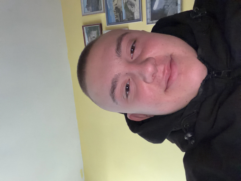 The image displays a young male subject positioned centrally, facing the camera directly. The subject has short, dark hair styled in a buzz cut, a fair complexion, and brown eyes. His facial expression is neutral to mildly pleasant, with his lips closed and slightly curved upwards. He is dressed in a dark, likely black, hooded jacket that appears insulated, with the front zipper partially unzipped. The background features a light yellow wall beneath a white ceiling. Mounted on the yellow wall, to the right of the subject, are several framed pictures. These images depict landscapes or architectural elements, including one of a building in a natural setting and another resembling a coastal scene. The scene is located in the city of Burgas, Bulgaria.