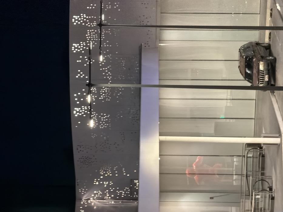 A modern building featuring a white facade with geometric perforations and hanging light fixtures is juxtaposed with a glass-walled area revealing an abstract red sculpture inside. A dark-colored car is parked nearby on the street. The building's design is both contemporary and airy.