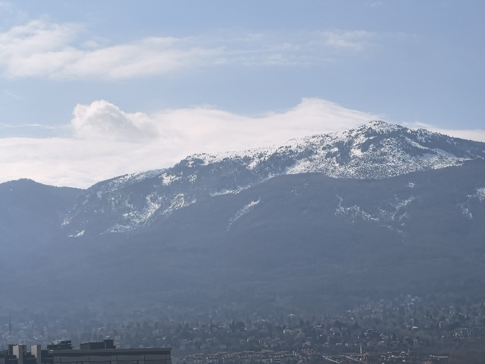 The image depicts Vitosha mountain overlooking the city of Sofia, Bulgaria, under a partially cloudy sky