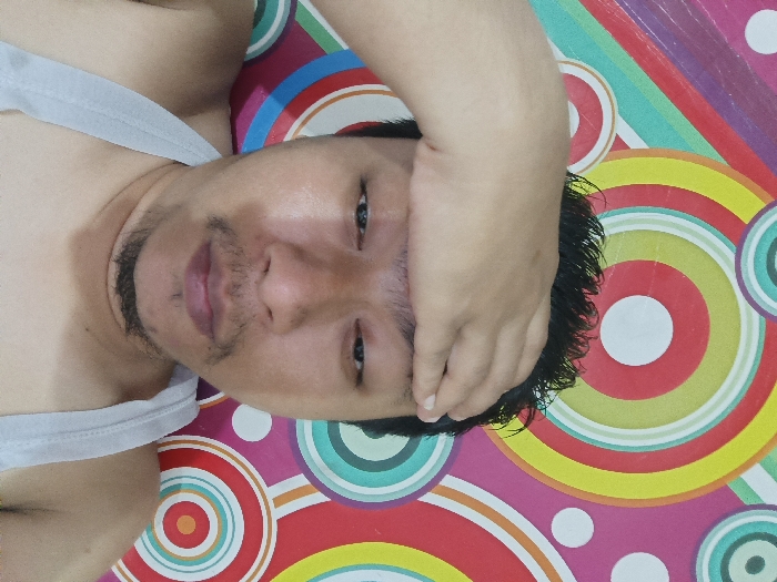 A single adult male is depicted in a close-up, rotated portrait, appearing to be lying down on a surface covered with a multi-colored patterned fabric. The male has short dark hair, a mustache, and a goatee. He is wearing a white sleeveless undershirt. His right hand is placed across his forehead. His eyes are open and directed towards the viewer. The background consists of a textile or mat featuring an abstract design of concentric circles in shades of red, yellow, green, blue, pink, purple, and white. The specific location within the city of Maleber, Indonesia, cannot be determined from the visual information provided. The scene appears to be an indoor, domestic setting.