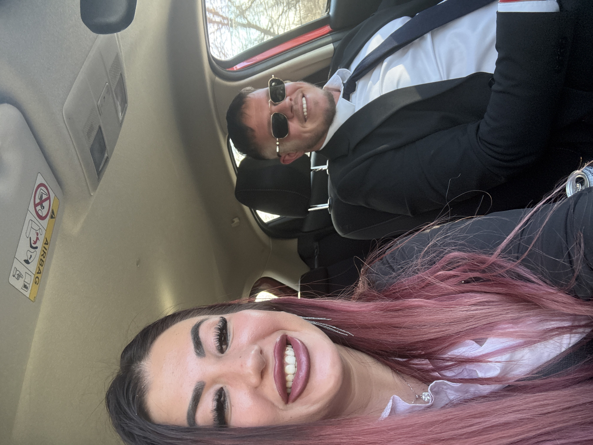 An interior vehicle photograph taken in Mirovyane, Bulgaria, depicts two individuals. A female is positioned in the foreground on the left, capturing a selfie. She has long, dark pink hair, prominent eyelashes, dark pink lipstick, and is smiling broadly, revealing white teeth. She wears a white collared shirt, a dark outer garment, a silver pendant necklace, and long, dangling silver earrings. Seated to her right and slightly behind is a male, wearing dark, rectangular sunglasses with gold-colored frames, a dark suit jacket, a white shirt, and a dark tie. He is also smiling towards the camera. The vehicle's interior features black seats and a light-colored headliner with an overhead light console. An "AIRBAG" warning label is visible on the passenger-side sun visor. Bare tree branches are discernible through the passenger window, indicating an outdoor, daytime setting. A silver beverage can with red lettering is visible in the lower left portion of the image.