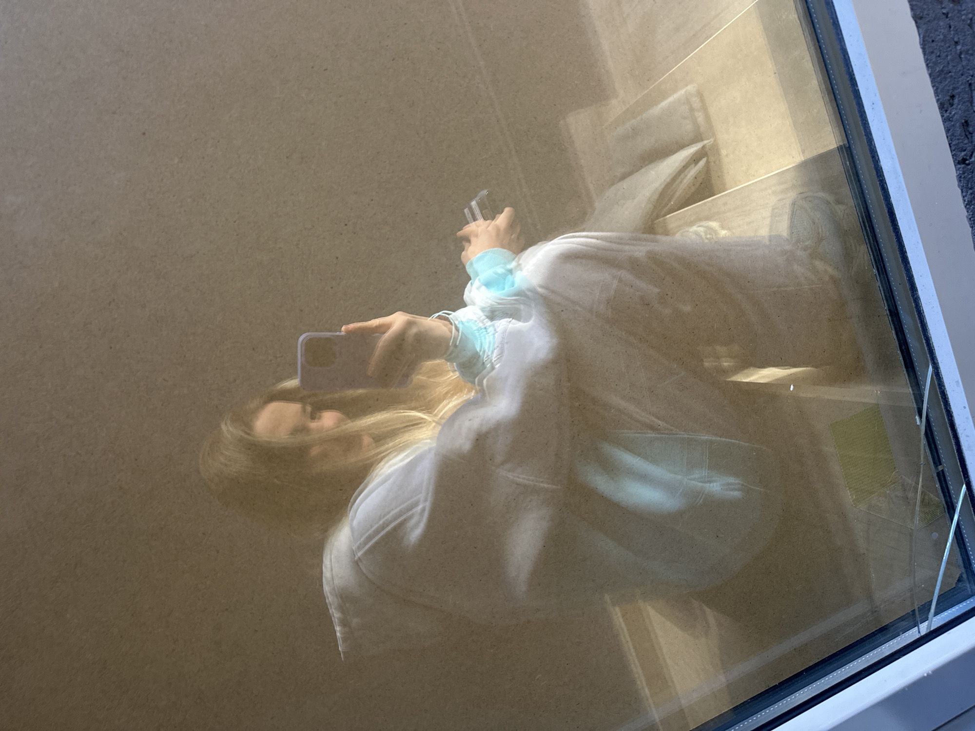 woman taking a selfie in a reflective window. She is wearing a white hoodie with light blue accents. She is holding a purple cell phone in her left hand, and another small, clear object in her right hand. Her hair is blonde. The reflection also shows an interior space with light-colored walls and steps leading upwards. The window frame is visible, with a white frame on the right side. The location is unknown.