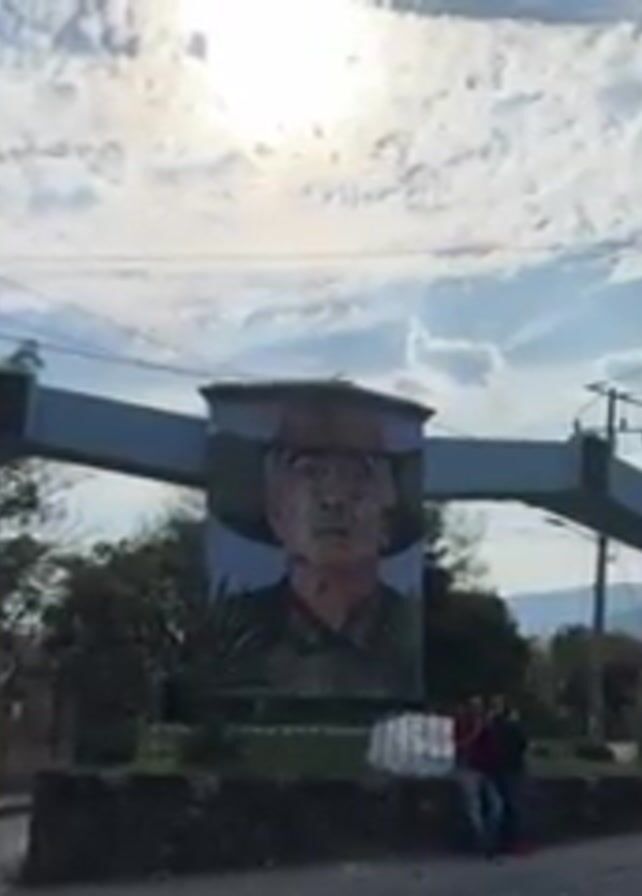 n archway painted pale blue with a large portrait of a man wearing a hat. The portrait is centered on the archway, and the sky is visible behind it, with some trees and mountains in the background. There is a group of people standing near a bus to the right of the archway. Two people are standing to the left of the archway. The video zooms in on the portrait.