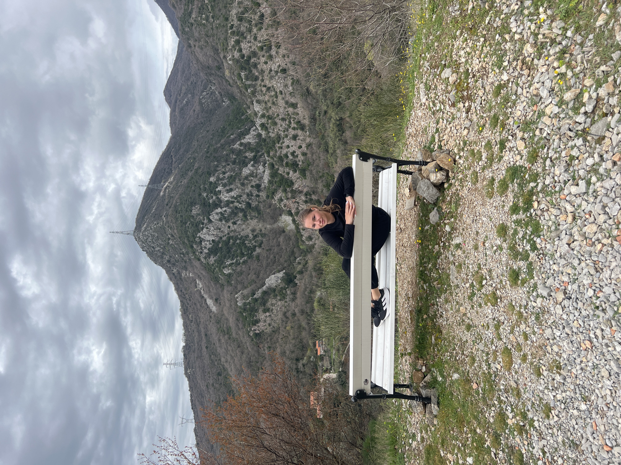 young woman sitting on a white bench. The background features a mountain, a cloudy sky, and power lines. The ground near the bench is covered in gravel and sparse vegetation. The location is in Krapina, Montenegro.