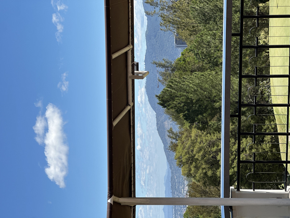 A vertical view captures blue sky with fluffy white clouds to the left. A covered structure is visible on top. Through an opening, a cityscape and mountains recede into the distance, bordered by green trees. A dark metal railing occupies the right edge. The image is bright and captures an outdoor scene.