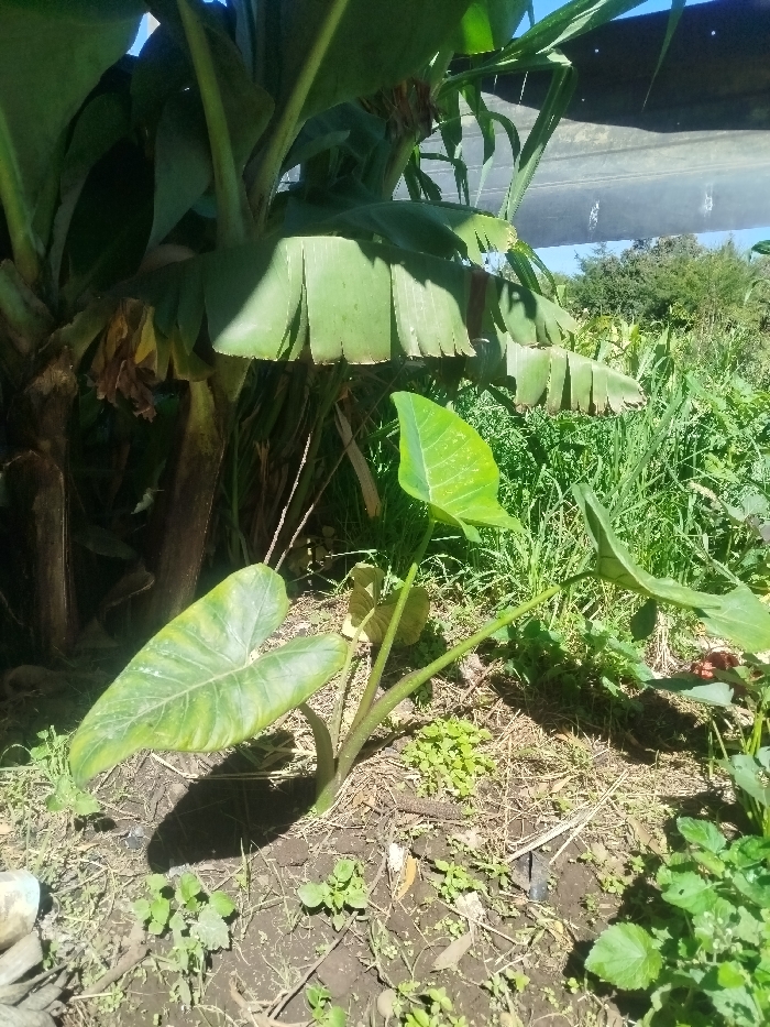 A banana tree stands prominently with large, green leaves. In front of it, taro plants thrive with broad, heart-shaped leaves. The ground around the plants is a mix of soil, small weeds, and grass. Sunlight streams through the canopy, creating patches of light and shadow on the ground. A metal structure is vaguely visible in the background.